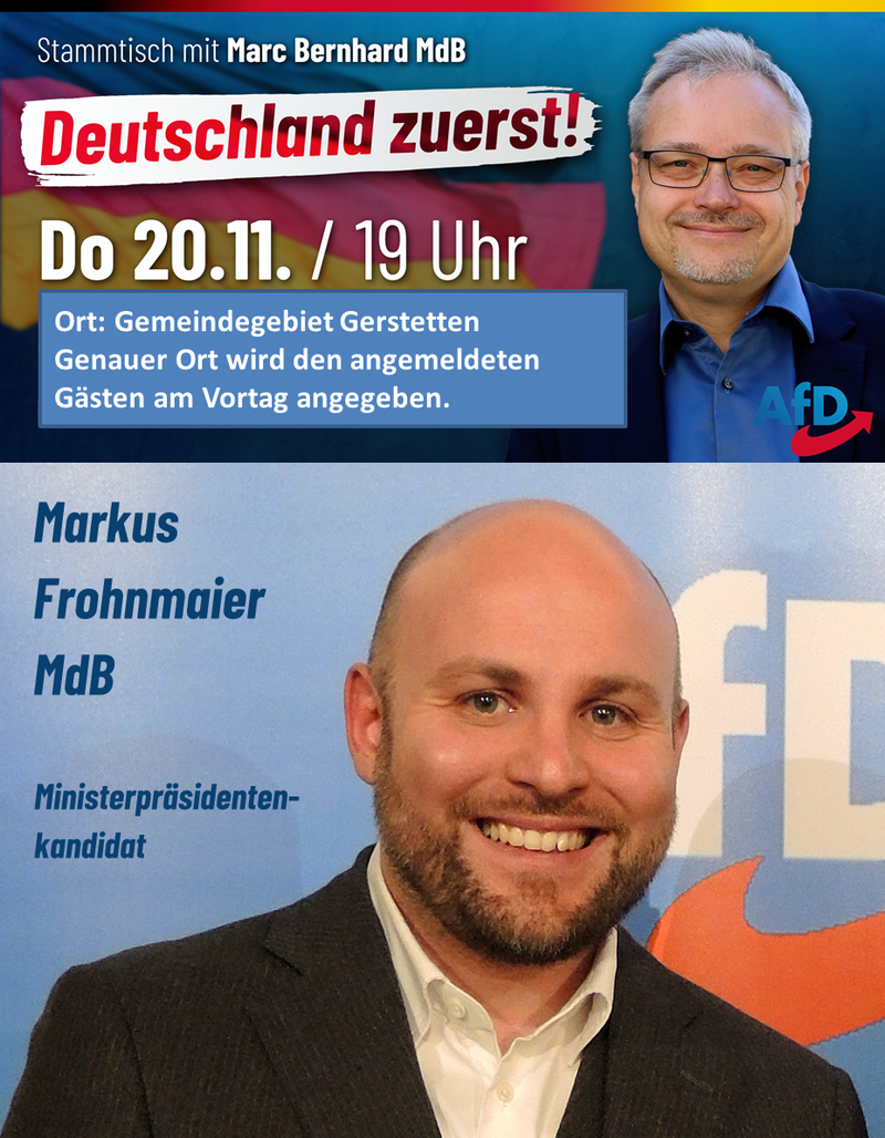 Liebe Mitglieder, Freunde und Unterstützer des AfD Kreisverbandes Heidenheim, Sie sind herzlich zu unserem Stammtisch am 20. November 2025 mit Marc Bernhard und Markus Frohnmaier eingeladen. Beginn ist 19:00 Uhr, Einlass ab 18:00 Uhr.