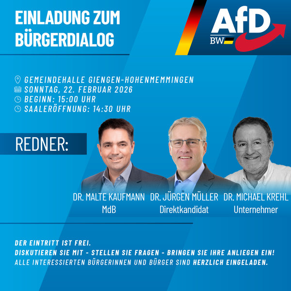 Der AfD Kreisverband Heidenheim lädt herzlich ein, zum Bürgerdialog mit dem Bundestagsabgeordneten Dr. Malte Kaufmann, mit unserem Direktkandidaten für den Wahlkreis Heidenheim, Dr. Jürgen Müller, und dem Unternehmer Dr. Michael Krehl. Die Veranstaltung findet am 22. Februar 2026 um 15:00 Uhr in der Gemeindehalle Giengen-Hohenmemmingen statt. Einlass ist ab 14:30 Uhr. Stellen Sie im Anschluss an die Impulsvorträge Ihre Fragen an die Redner und kommen Sie mit den Referenten ins Gespräch.